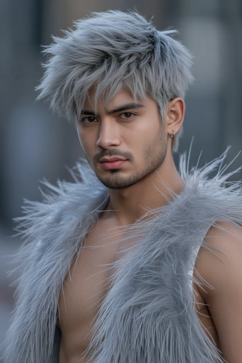 This soft crop features gentle spikes and a frosted ash gray tone, echoing Killua’s youthful, fierce energy. The textured top adds movement, making thin or fine hair appear fuller.